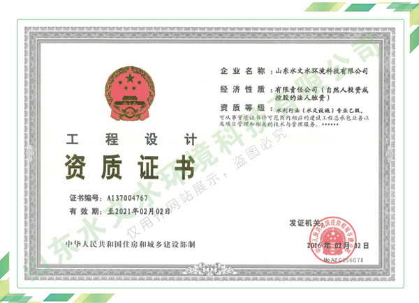 公司擁有水利工程設(shè)計(jì)、水土保持、水文水資源調(diào)查評價(jià)、水資源論證、建設(shè)項(xiàng)目環(huán)境影響評價(jià)、市政公用工程施工總承包、水利水電工程施工總承包、電子與智能化工程專業(yè)承包等資質(zhì),2017年通過質(zhì)量管理體系、環(huán)境管理體系、職業(yè)健康安全管理體系認(rèn)證;2020年被評為國家級高新技術(shù)企業(yè),同年被中國水利企業(yè)協(xié)會推薦為第一批“合同節(jié)水服務(wù)企業(yè)”;2021年被山東省、濟(jì)南市評為 “專精特新”中小企業(yè)。業(yè)務(wù)范圍涉及水利工程設(shè)計(jì);節(jié)水設(shè)計(jì)、改造、水平衡測試;山洪災(zāi)害調(diào)查;城市水資源調(diào)查評價(jià);建設(shè)項(xiàng)目水土保持方案編制、監(jiān)測、驗(yàn)收、水土保持規(guī)劃;水安全保障規(guī)劃、建設(shè)項(xiàng)目水資源論證、規(guī)劃水資源論證;建設(shè)項(xiàng)目環(huán)境影響評價(jià);入河排污口論證;防洪影響評價(jià);市政公用工程施工、水利水電工程施工、電子與智能化工程施工等。